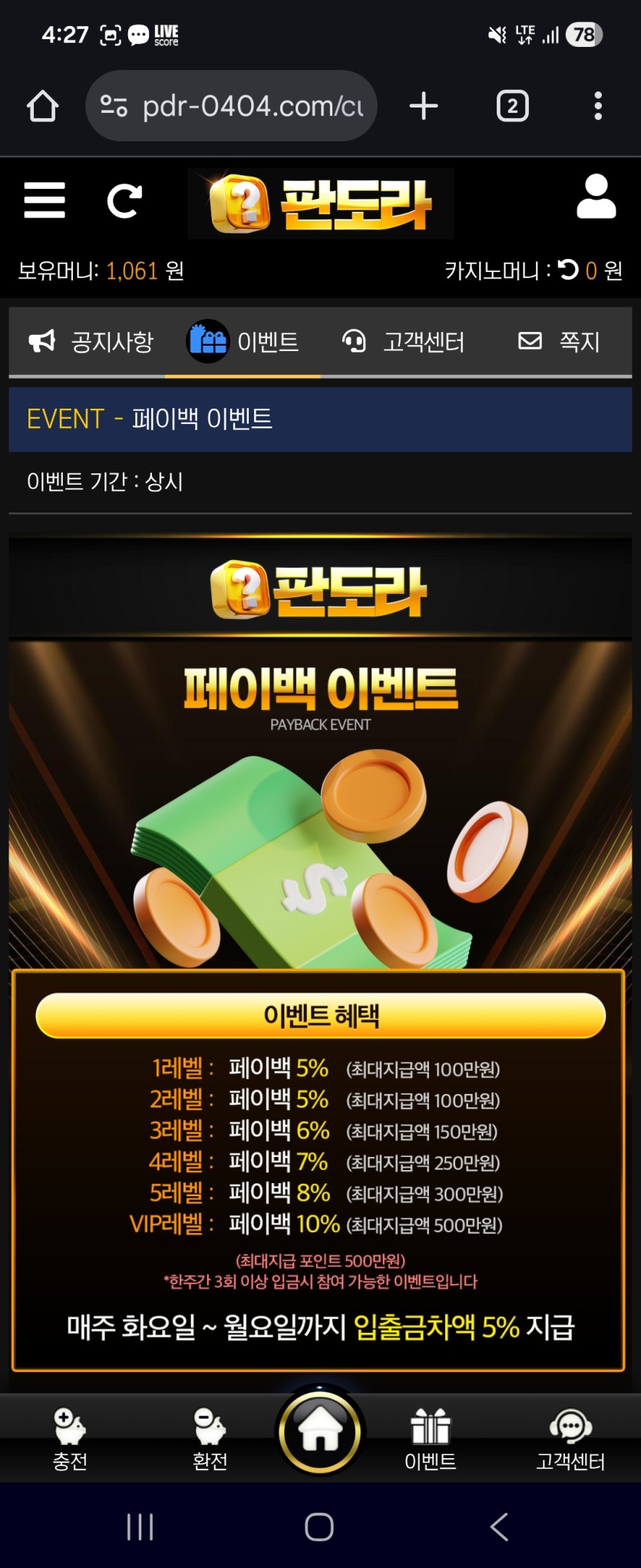 해야지 매주 최대 10프로 페이백 루징주고